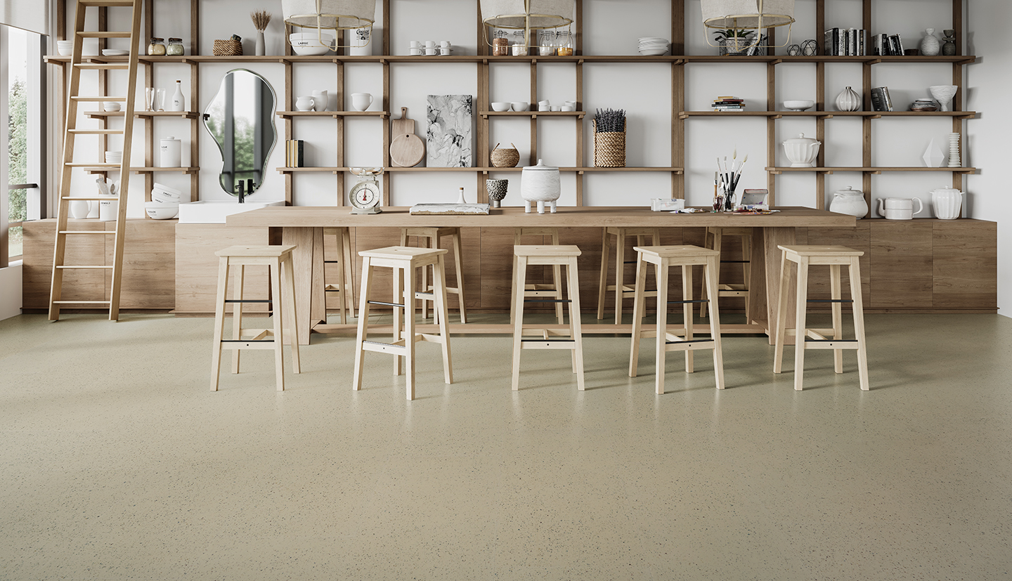 - Terrazzo-inspired surface with refined speckle patterns blending classic stone aesthetics with a modern, minimalist twist
